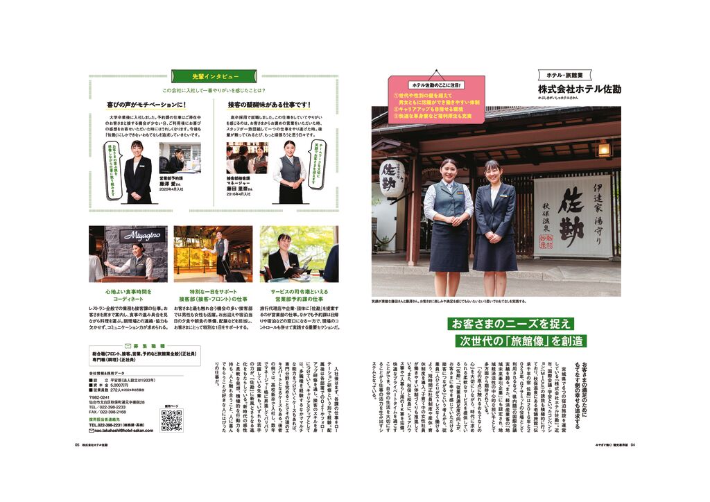 Back Number バックナンバー ホーム » バックナンバー » みやぎで働く!2024年観光業界版 みやぎで働く!2024年観光業界版 株式会社ホテル佐勘 株式会社グリーンキャブ仙台支社(日交タクシー) 仙台市交通局 株式会社ジーコ(牛タン焼専門店司) 宮城県松島離宮(丸山株式会社) 名鉄観光サービス株式会社
