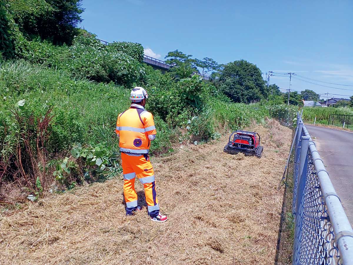 高速道路ののり面に繁茂する樹木の剪定や伐採、草刈り作業を行い、適正な育成と管理を行う植栽作業。特に草刈り作業ではラジコン草刈り機を導入、作業負担の軽減および作業の効率化を図っている。