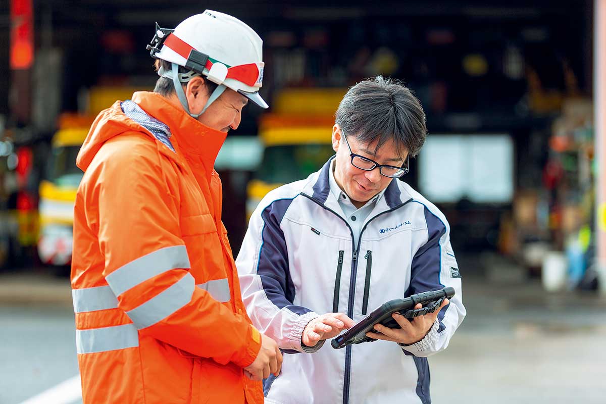 業務を進める上で何よりも優先されるのは❝安全❞。その実現に欠かせないのが、総合職と現場作業を行う技能職のコミュニケーションとチームワークだ。社内には、互いに尊重しながら連携して業務を進める風土が根付いている。