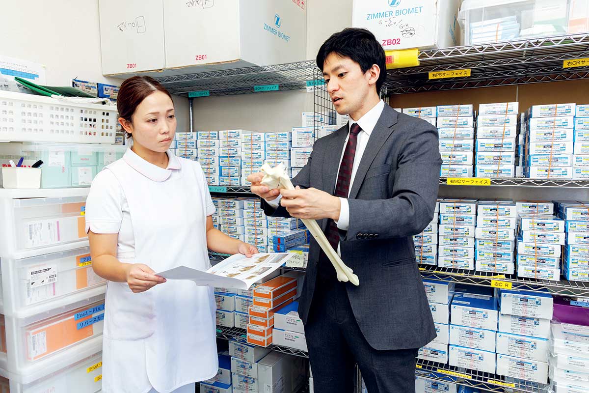 85万点を超える医療機器やシステムを現場に届け、地域医療を支え続けて60年。『丸木医科器械』では約35年にわたり毎年新卒採用を続けており、研修制度や福利厚生など、働きやすさを支える制度が整っている。入社10年目の志村拓哉さんは、整形外科分野を専門に複数施設を担当する営業職。「医療分野は技術の進歩が早く、最新情報をキャッチできていれば若手が先輩に教える場面もある。整形のオペでは骨や腱などが先生の手技により正常な状態に整っていき、それを支えることにやりがいを感じます」と語る。