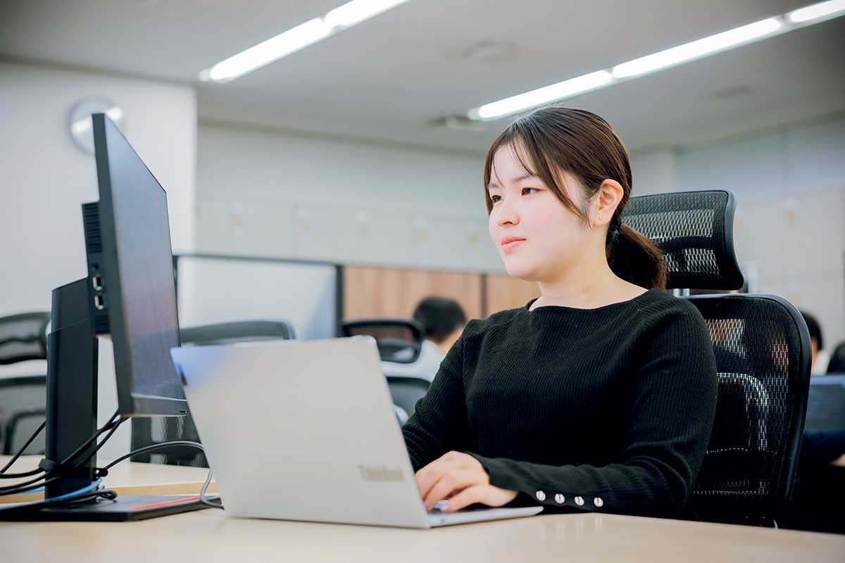 現在は一般企業向けの請求管理システムの開発を3人体制で手がけています。ITとは無縁の文系学部出身ですが、技術的なことは入社後に基礎からしっかり教わることができました。お客様との打ち合わせやチーム内でのすり合わせの機会も多く、コミュニケーション力も必要な仕事です。