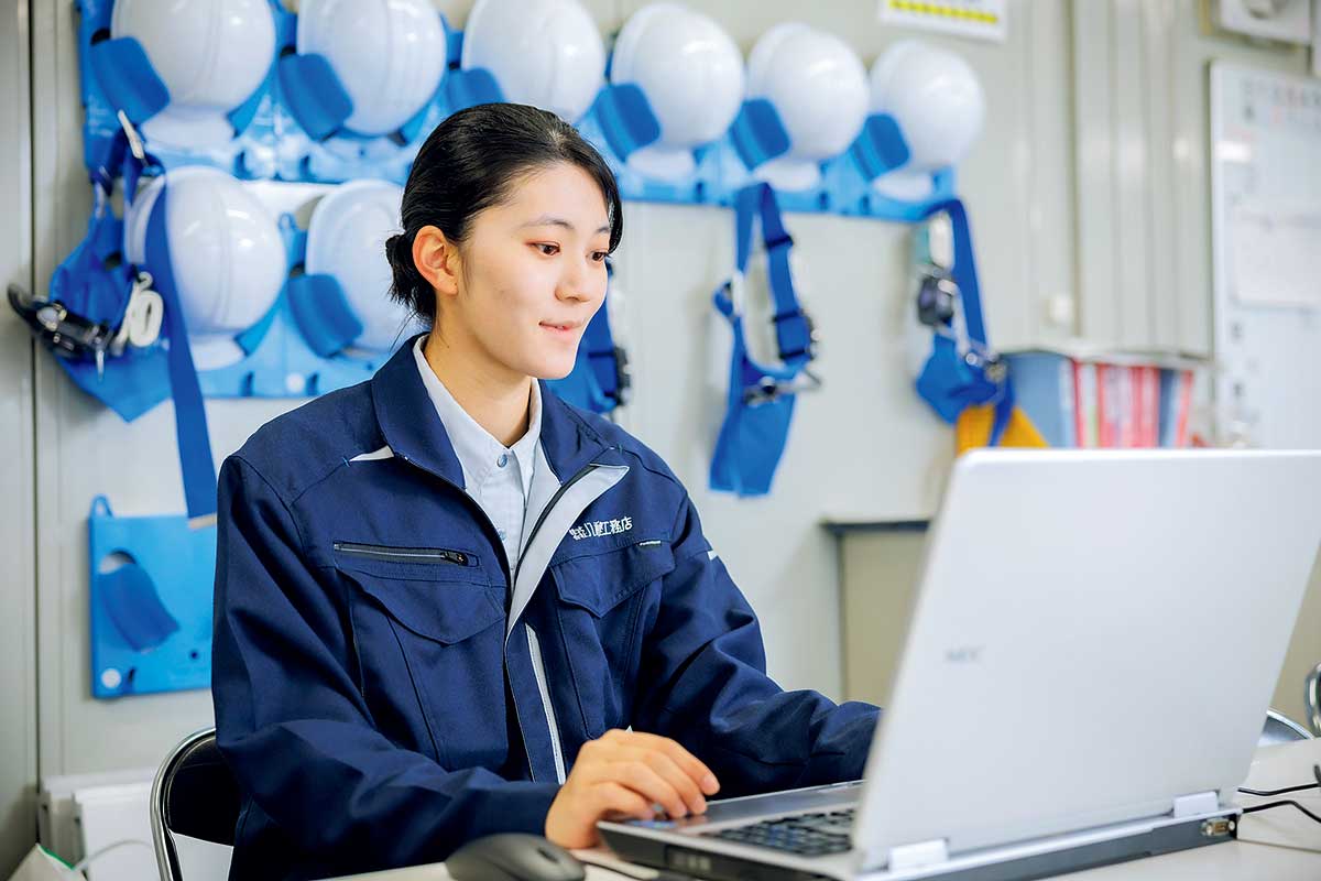 ◯女性技術者も活躍中。現場の全体を管理する施工管理はやりがいのある仕事だ。
