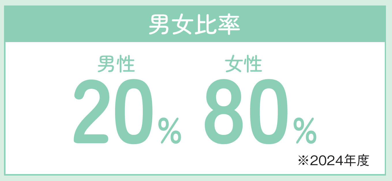 る。また、約8割を女性従業員が占めることから、女性活躍推進法や次世代育成支援対策推進法に基づき、女性が働きやすい環境づくりに力を入れている点も強みだ。子育てサポート企業の証である「くるみん」の認定も受けるなど、特に子育て支援は手厚く、産休・育休制度も完備。両立支援コーディネーターの研修を受けた社員の支援もあり、育休後の女性従業員の職場復職率は100%に達している。長く働きたい人にとって心強い限りだろう。