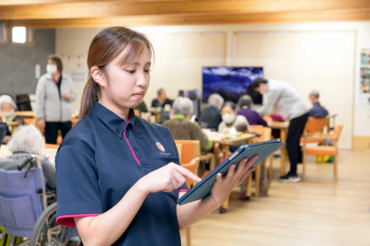 利用者の日々の健康管理はタブレットで。ペーパーレス化で業務改善・効率化も図る。