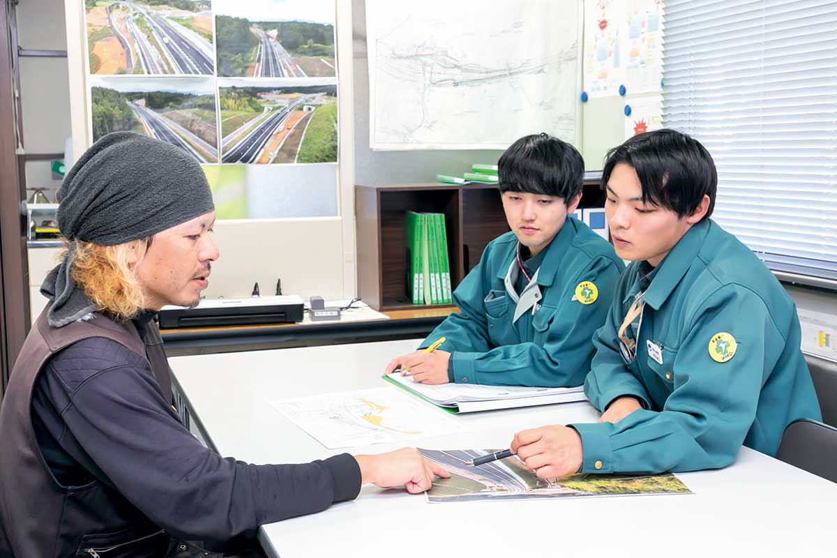 若手が現場の最前線で活躍する『若生工業』。道路や河川、学校、役場支所など、地域インフラを支える公共工事を中心に、土木・建築の幅広い分野を手がけ、地域の暮らしを支えている。従業員の約3割にあたる20名が10~20代で、年代の近い先輩が多く、互いに相談しやすい雰囲気がある。入社後は約1カ月の研修で測量や安全管理の基礎を学び、現場では先輩の指導を受けながらOJTで技術を磨く。世代を超えて意見を交わす風土があり、考え方の違いを補い合うことで、互いによい刺激を与え合っている。