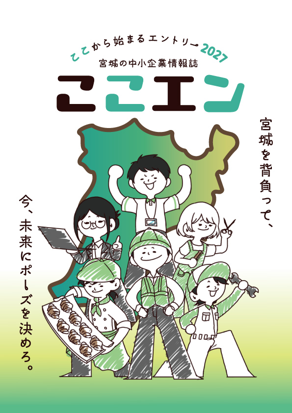 「ここエン」は、宮城県内で活躍する中小企業の魅力を丁寧に紹介する情報誌です。企業の理念や大切にしている想い、そこで働く人の姿、地域への関わりなど、人と仕事のストーリーをわかりやすく伝えています。学生が宮城の企業を深く知り、自分らしい働き方を見つけるヒントにしよう!