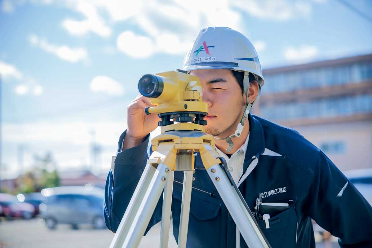 入社1年目の今は、まだ先輩について勉強中。調整池を造る現場で、光波という機械を使った丁張りと呼ばれる仕事を担当しています。丁張りとは建造物の位置や高さを正確に示すための仮設構造物のこと。自分の作業により工事の精度が左右されるので、緊張感を持って取り組んでいます。