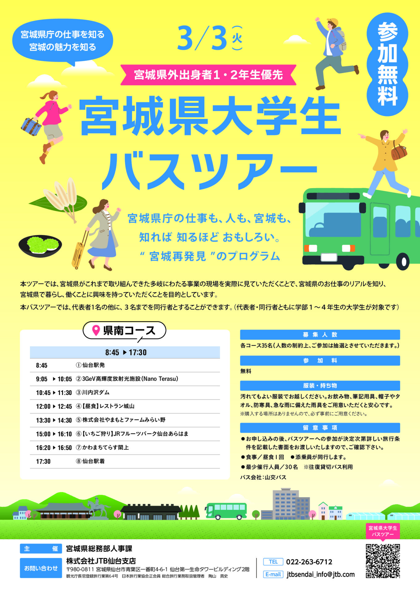 宮城県内の大学生を対象に、県内各地の施設や事業現場を巡りながら、宮城での暮らし・働き方について理解を深めるバスツアーの第2弾【県南コース】が開催されます。