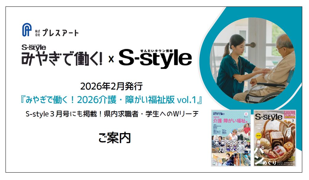 毎回、掲載企業様からも、読者からもご好評いただいている「みやぎで働く!介護・障がい福祉版」の2026年最新版を2026年2月27日(金)に発行します。今回は無料配布の冊子だけでなく、「せんだいタウン情報S-style2月号」にも掲載されるので、より多くの人にアプローチが可能です。